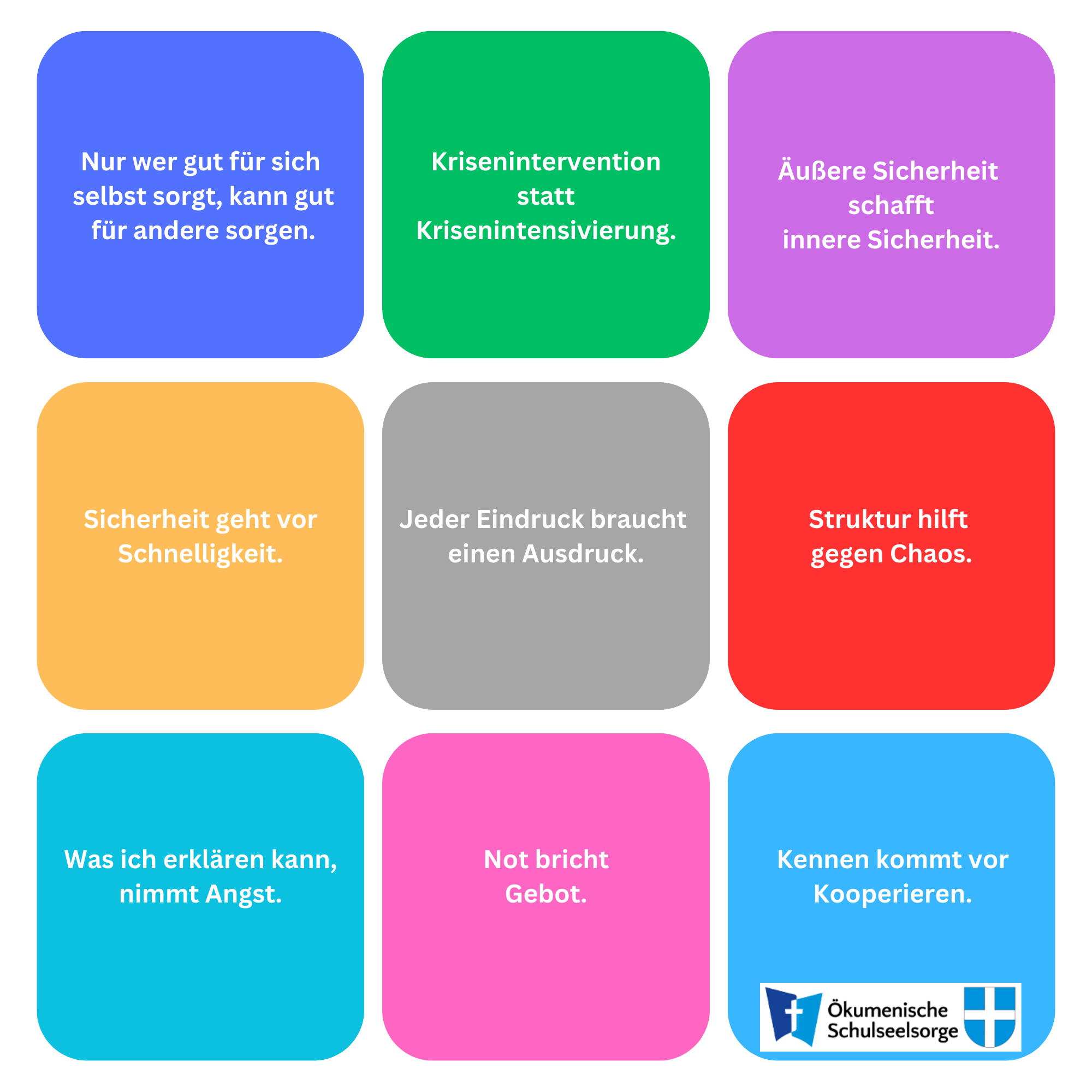 In 40 Unterrichtseinheiten á 45 Minuten werden theoretische und praktische Grundlagen für die Arbeit in der "Trauer- und Krisenseelsorge an Schulen" gelegt. Dazu werden u.a. folgende Themen behandelt: Ressourcen/Resilienz, Psychotraumatologie, Trauer, Krisenmanagement, Suizidalität, Psychische Gesundheit, Polizeiliche Lagen/Amok.