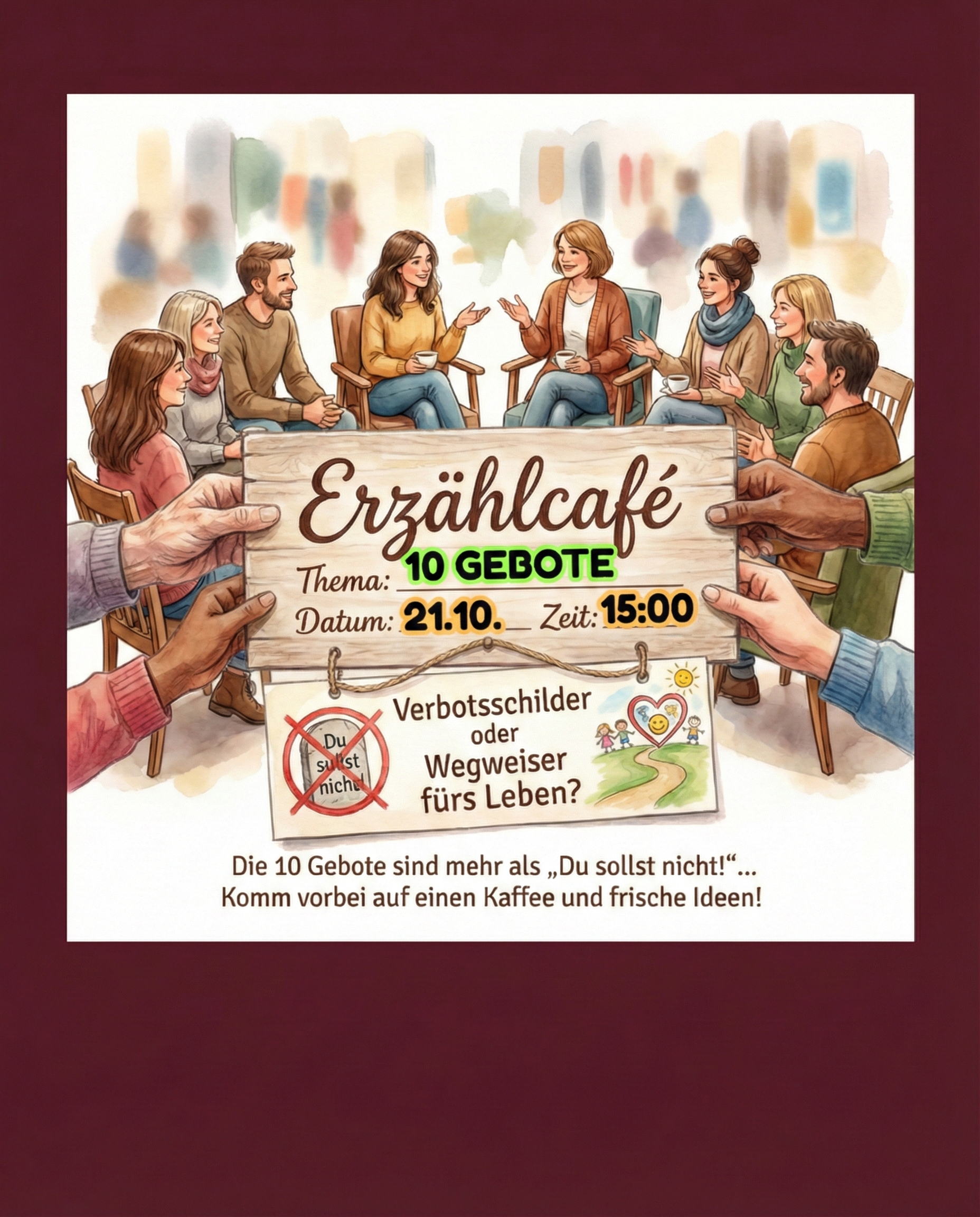 Die 10 Gebote sind mehr als "Du sollst nicht!". Wie wir diese uralten Weisungen als Schutzraum und Freiheitsangebot für Kinder von heute übersetzen – ohne den moralischen Zeigefinger, aber mit viel Praxisbezug – darum geht es im Erzählcafé. Komm vorbei auf einen Kaffee und frische Ideen!